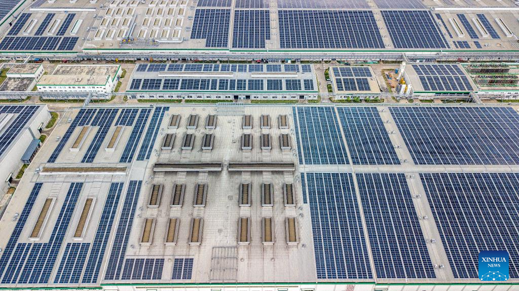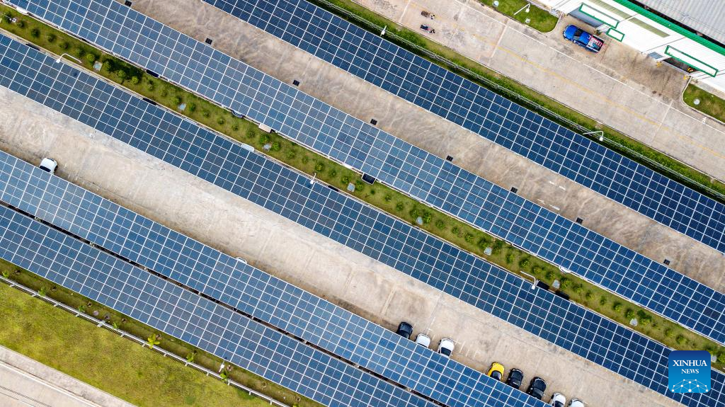 This aerial photo taken on Nov. 7, 2023 shows the solar rooftop at a tire factory in Chonburi province, Thailand. Chinese company Prinx Chengshan Tire and WHA Utilities and Power (WHAUP) of Thailand have been jointly building a solar rooftop for the tire factory in Chonburi Province. The first-phase of the project started operation at the end of November 2022, with an installed capacity of 19.44 MW. The second-phase of the project is expected to be completed in 2024, by which the total installed capacity will reach 24.24 MW, capable of reducing 30,000 tonnes of carbon dioxide emission annually. (Xinhua/Wang Teng)