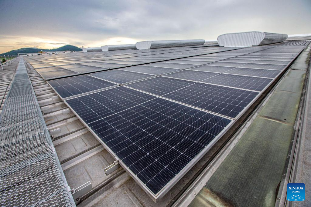 This photo taken on Nov. 7, 2023 shows the solar rooftop at a tire factory in Chonburi province, Thailand. Chinese company Prinx Chengshan Tire and WHA Utilities and Power (WHAUP) of Thailand have been jointly building a solar rooftop for the tire factory in Chonburi Province. The first-phase of the project started operation at the end of November 2022, with an installed capacity of 19.44 MW. The second-phase of the project is expected to be completed in 2024, by which the total installed capacity will reach 24.24 MW, capable of reducing 30,000 tonnes of carbon dioxide emission annually. (Xinhua/Wang Teng)