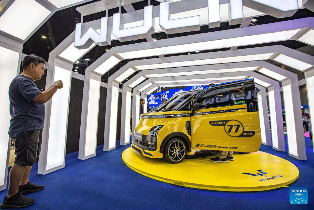 A visitor takes photos of a Wuling Air EV during the 40th Thailand International Motor Expo in Bangkok, Thailand, Dec. 6, 2023. The 40th Thailand International Motor Expo 2023 will last until Dec. 11. (Xinhua/Wang Teng)