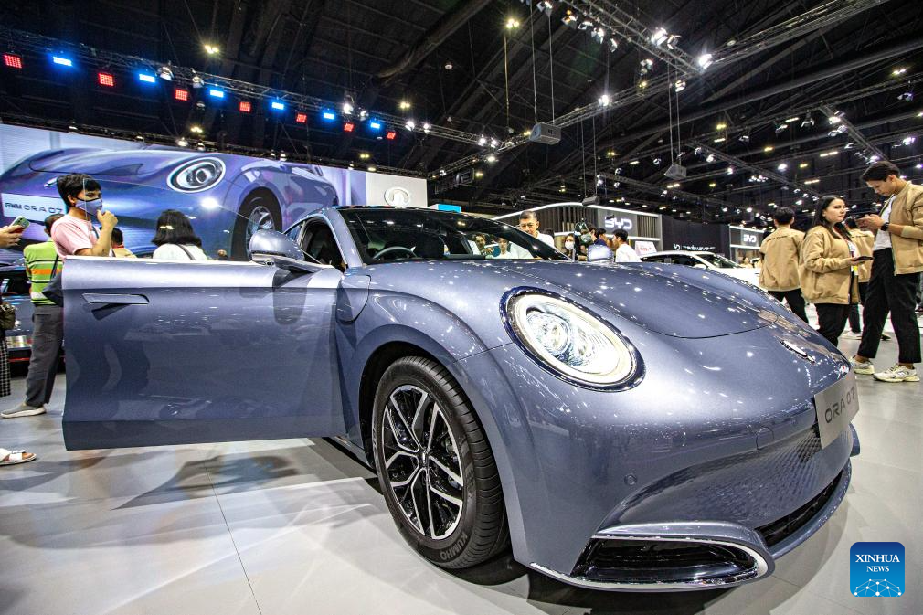 Visitors look at an Ora 07 during the 40th Thailand International Motor Expo in Bangkok, Thailand, Dec. 6, 2023. The 40th Thailand International Motor Expo 2023 will last until Dec. 11. (Xinhua/Wang Teng)