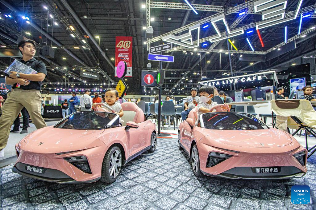 Children experience the NETA Magic Kid during the 40th Thailand International Motor Expo in Bangkok, Thailand, Dec. 6, 2023. The 40th Thailand International Motor Expo 2023 will last until Dec. 11. (Xinhua/Wang Teng)