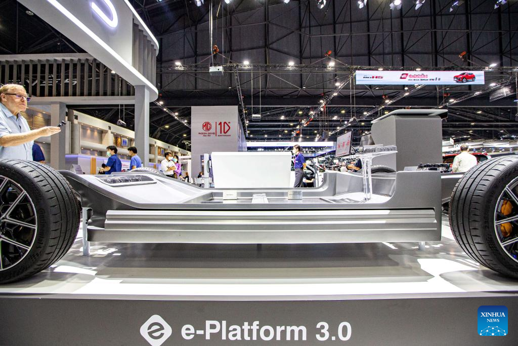A visitor takes photos of e-Platform 3.0 during the 40th Thailand International Motor Expo in Bangkok, Thailand, Dec. 6, 2023. The 40th Thailand International Motor Expo 2023 will last until Dec. 11. (Xinhua/Wang Teng)