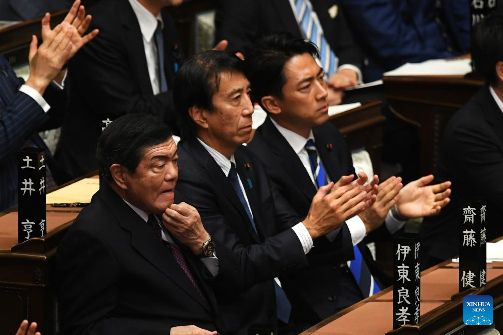 Ken Saito (C) attends the closing meeting of parliament in Tokyo, Japan, Dec. 13, 2023. Japanese Prime Minister Fumio Kishida on Thursday ousted all four cabinet ministers of the ruling party's largest faction, as he seeks to control the damage following a political fundraising scandal, local media reported.(Xinhua/Feng Wuyong)