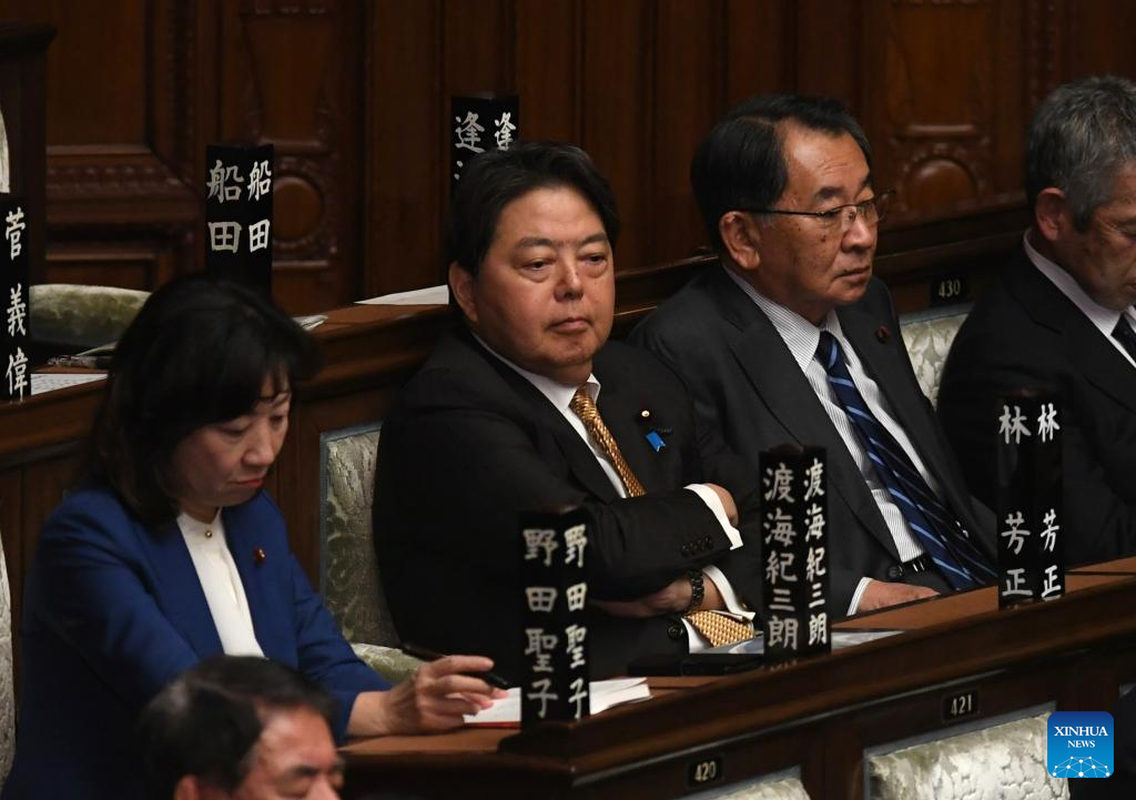 Yoshimasa Hayashi (2nd L) attends the closing meeting of parliament in Tokyo, Japan, Dec. 13, 2023. Japanese Prime Minister Fumio Kishida on Thursday ousted all four cabinet ministers of the ruling party's largest faction, as he seeks to control the damage following a political fundraising scandal, local media reported.(Xinhua/Feng Wuyong)