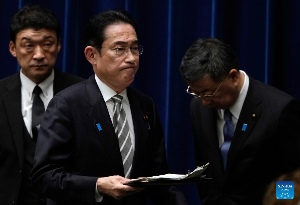 Japanese Prime Minister Fumio Kishida (C) leaves after a press conference in Tokyo, Japan, Dec. 13, 2023. Japanese Prime Minister Fumio Kishida on Thursday ousted all four cabinet ministers of the ruling party's largest faction, as he seeks to control the damage following a political fundraising scandal, local media reported.(Frank Robichon/Pool via Xinhua)