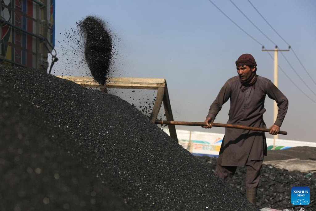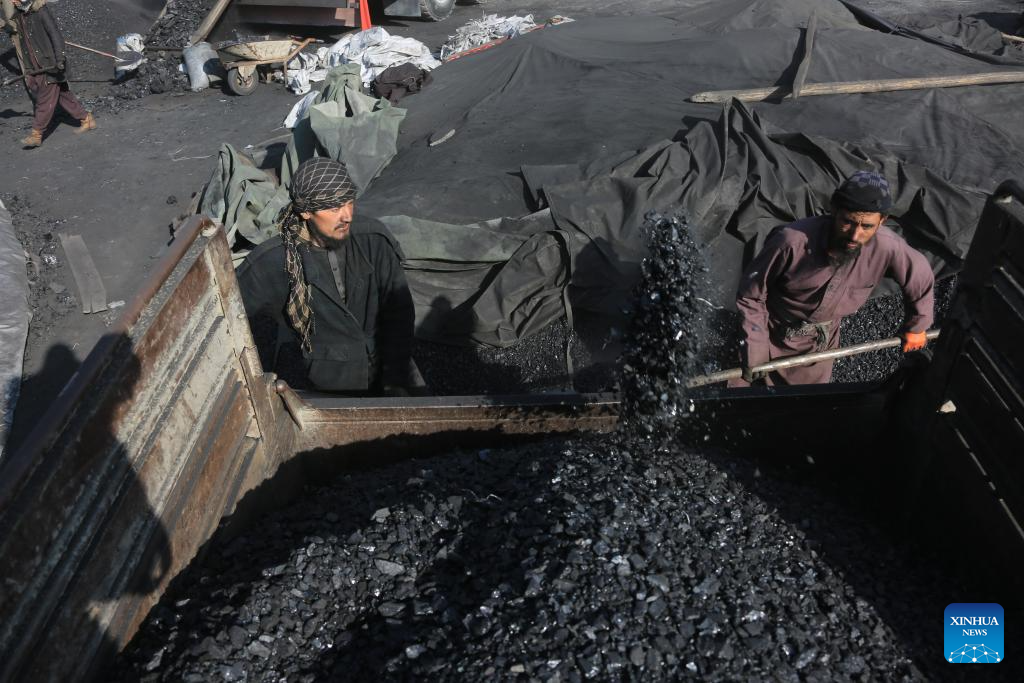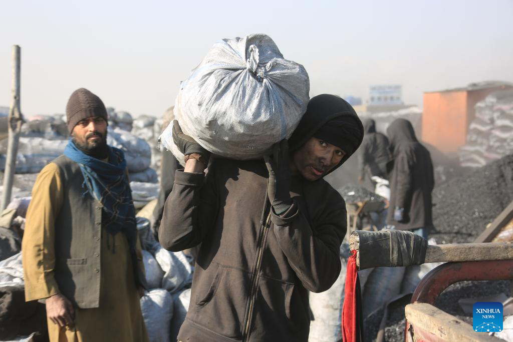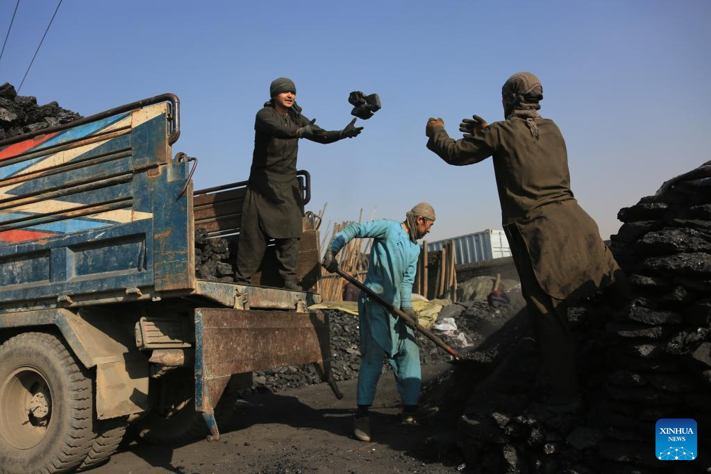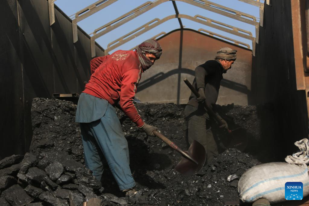 People work at a coal market in Kabul, capital of Afghanistan, Dec. 19, 2023. (Photo by Saifurahman Safi/Xinhua)