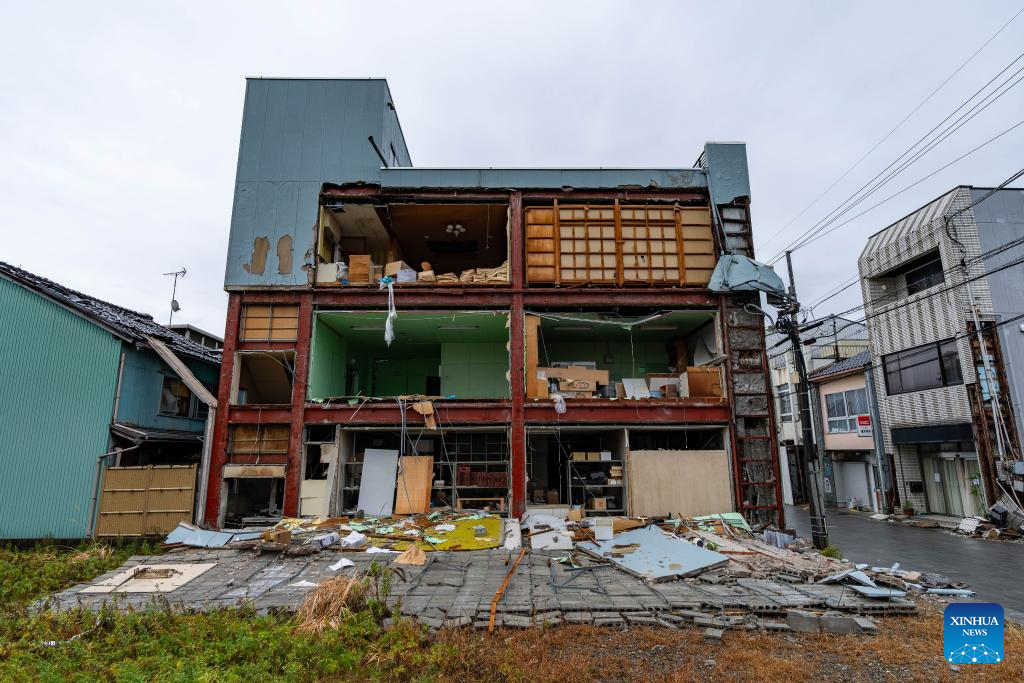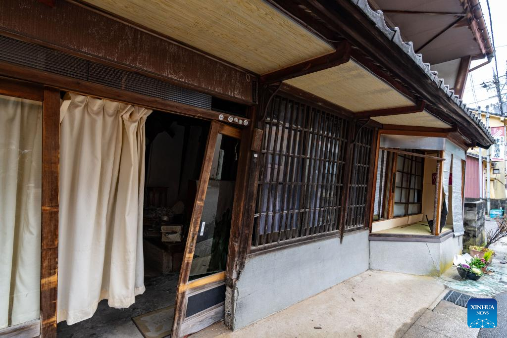 This photo taken on Jan. 3, 2024 shows an earthquake-damaged house in Nanao, Ishikawa prefecture, Japan. The death toll has risen to 55 in the central Japanese prefecture of Ishikawa as of Tuesday evening, after a series of powerful earthquakes hit the area in central Japan and the vicinity, with aftershocks and more damage reports coming in. (Xinhua/Zhang Xiaoyu)