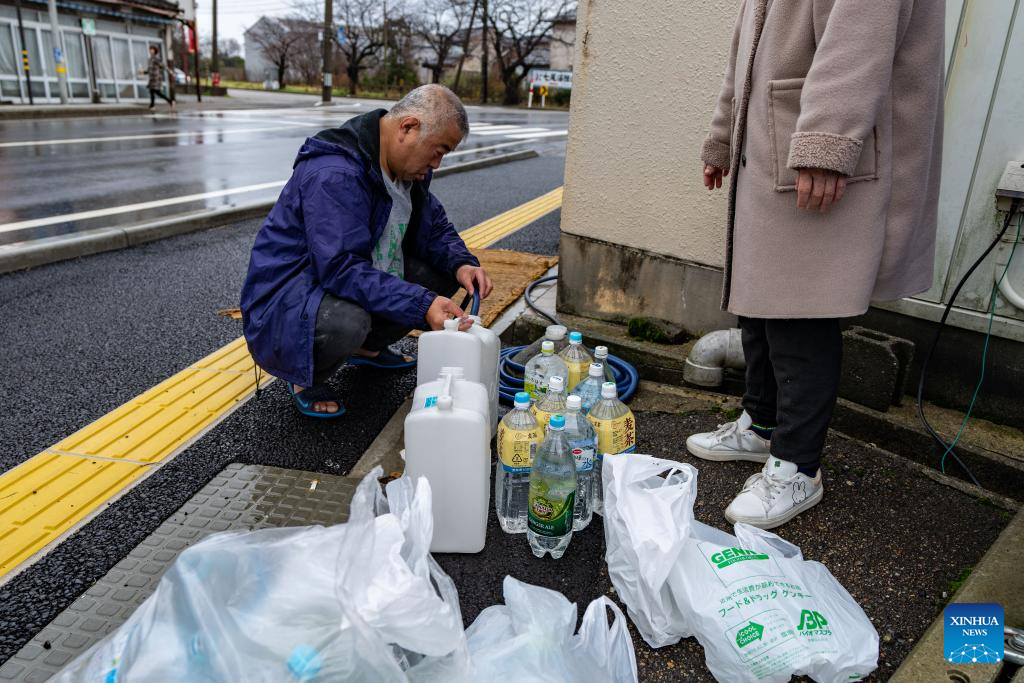 Residents fetch fresh water at an aquatic products store in Nanao, Ishikawa prefecture, Japan, Jan. 3, 2024. Electric power and tap water supplies have been cut off here due to recent earthquakes. The death toll has risen to 55 in the central Japanese prefecture of Ishikawa as of Tuesday evening, after a series of powerful earthquakes hit the area in central Japan and the vicinity, with aftershocks and more damage reports coming in. (Xinhua/Zhang Xiaoyu)