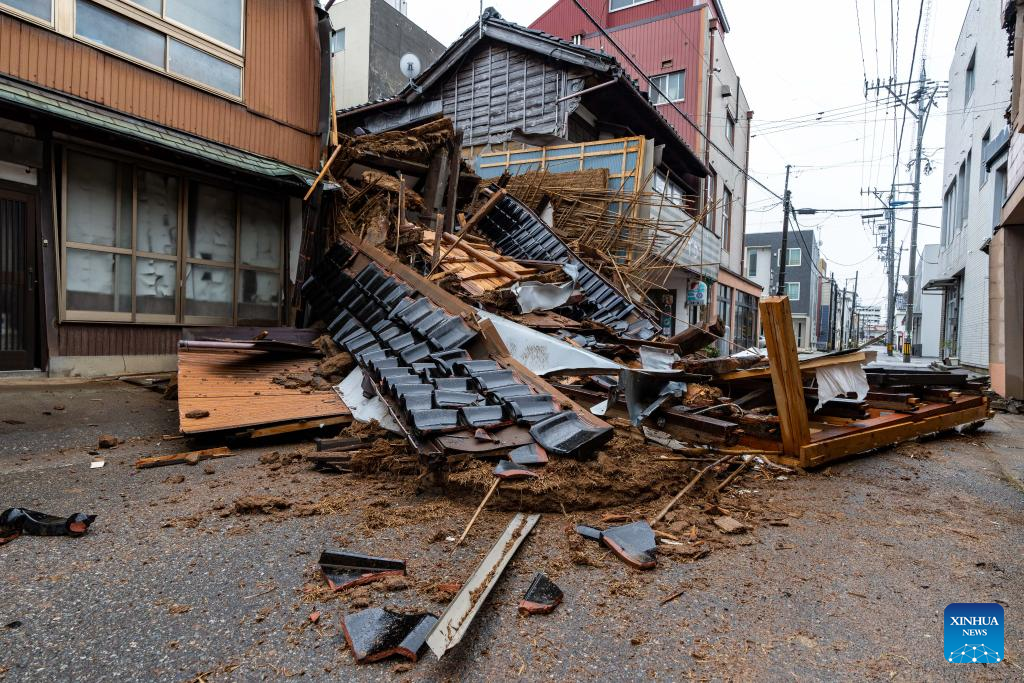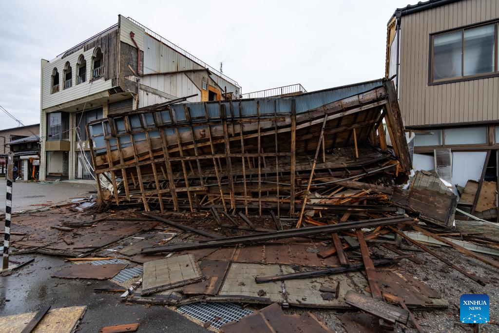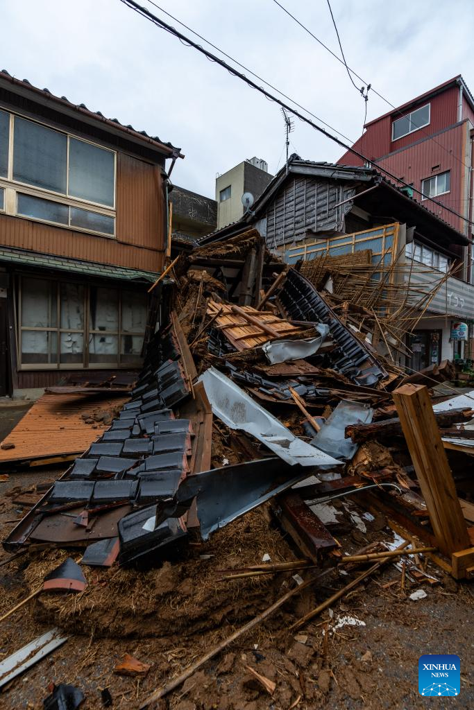 This photo taken on Jan. 3, 2024 shows a collapsed house in Nanao, Ishikawa prefecture. The death toll has risen to 55 in the central Japanese prefecture of Ishikawa as of Tuesday evening, after a series of powerful earthquakes hit the area in central Japan and the vicinity, with aftershocks and more damage reports coming in. (Xinhua/Zhang Xiaoyu)