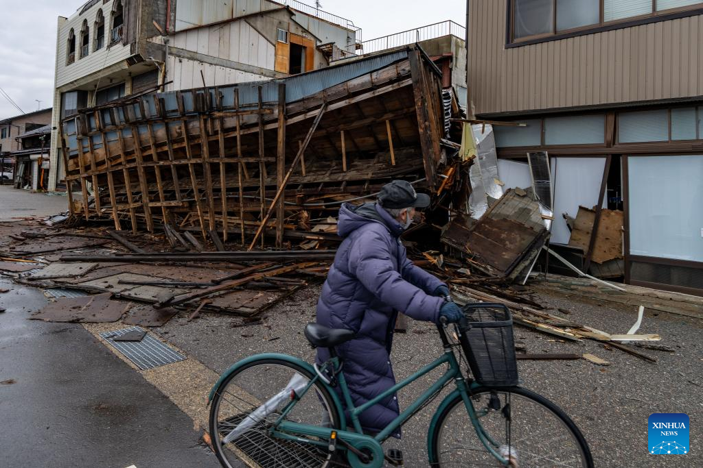 A man passes by earthquake-damaged houses in Nanao, Ishikawa prefecture, Japan, Jan. 3, 2024. The death toll has risen to 55 in the central Japanese prefecture of Ishikawa as of Tuesday evening, after a series of powerful earthquakes hit the area in central Japan and the vicinity, with aftershocks and more damage reports coming in. (Xinhua/Zhang Xiaoyu)