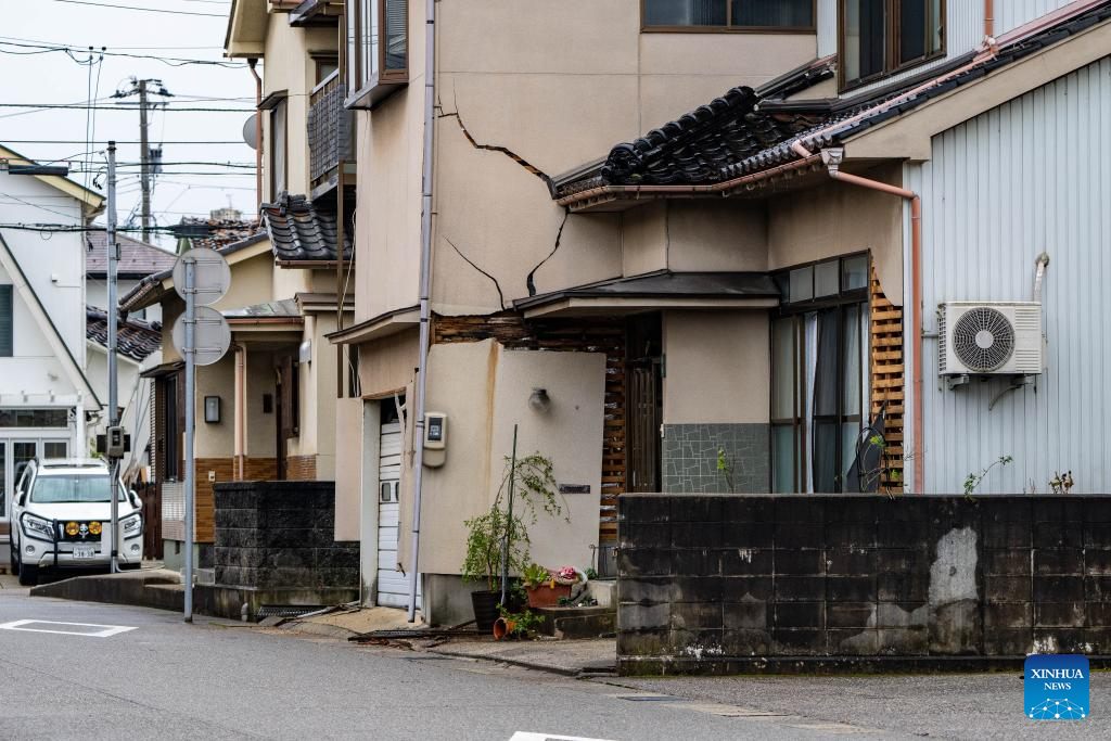 This photo taken on Jan. 3, 2024 shows an earthquake-damaged house in Nanao, Ishikawa prefecture. The death toll has risen to 55 in the central Japanese prefecture of Ishikawa as of Tuesday evening, after a series of powerful earthquakes hit the area in central Japan and the vicinity, with aftershocks and more damage reports coming in. (Xinhua/Zhang Xiaoyu)