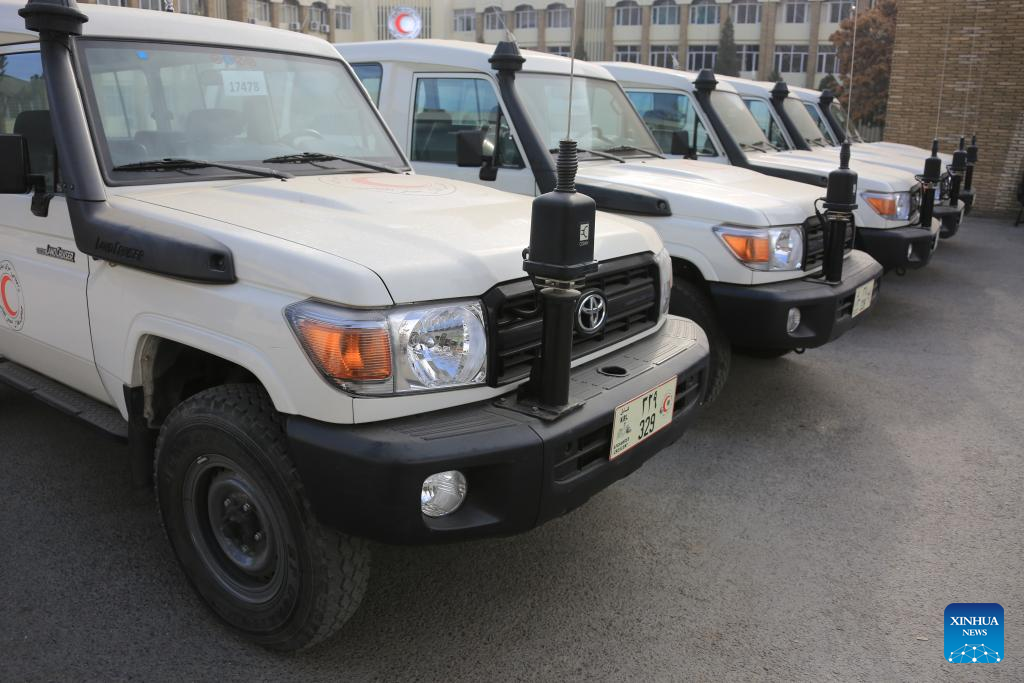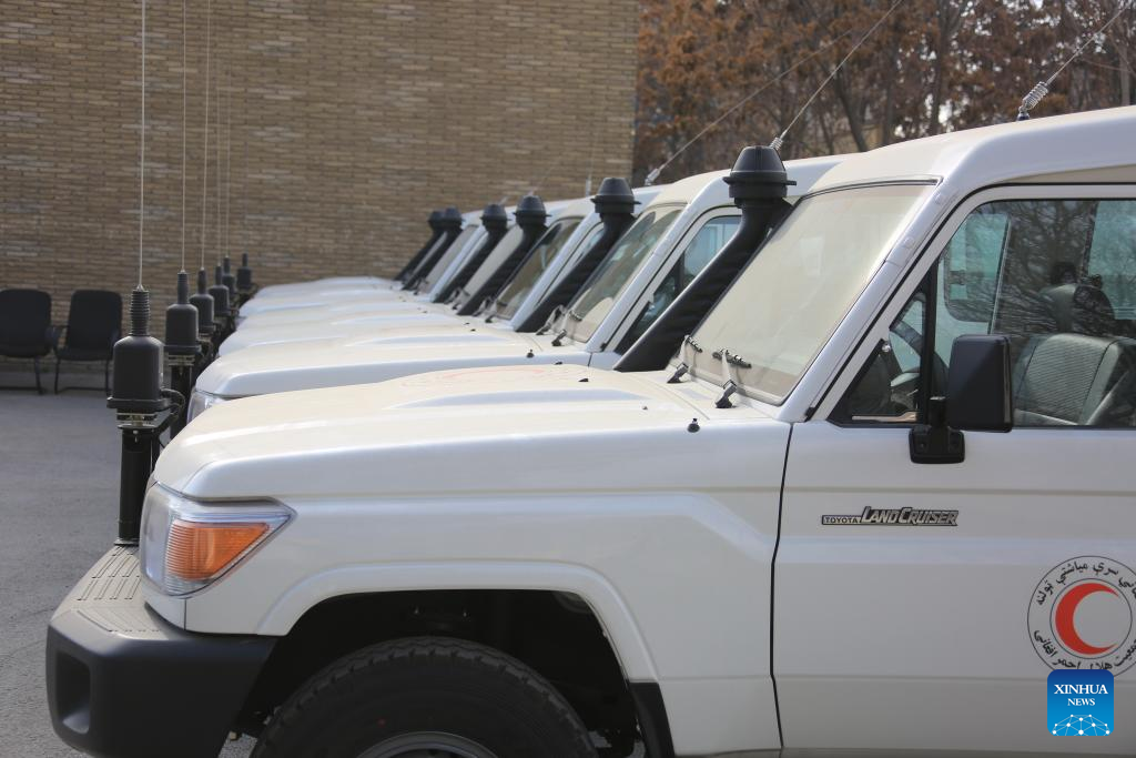 This photo taken on Jan. 2, 2024 shows the ambulances donated by the International Committee of the Red Cross (ICRC) to the Red Crescent Society of Afghanistan in Kabul, Afghanistan.