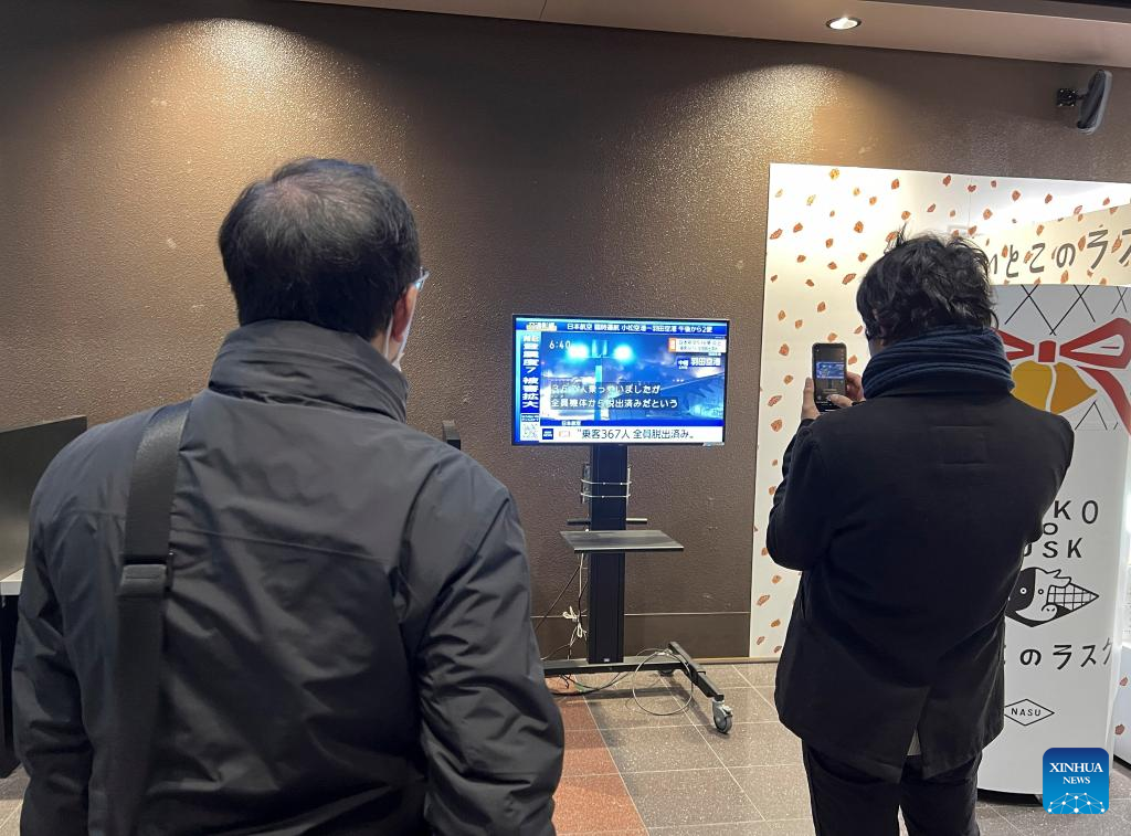 Meanwhile, all 367 passengers and 12 crew members on board the Japan Airlines flight escaped from the airplane while it was on fire without life-threatening injuries after it collided with the smaller Coast Guard aircraft at around 5:50 p.m. local time, the NHK reported. (Xinhua/Hu Xiaoge)