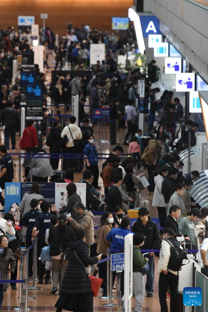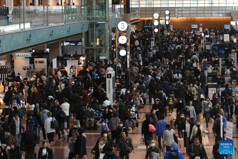 Stranded passengers are pictured after an aircraft collision at the Haneda Airport in Tokyo, Japan, Jan. 3, 2024. (Xinhua/Yue Chenxing)