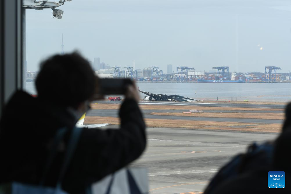 Passengers look at the wreckage of JAL Flight 516 after an aircraft collision at the Haneda Airport in Tokyo, Japan, Jan. 3, 2024. (Xinhua/Yue Chenxing)