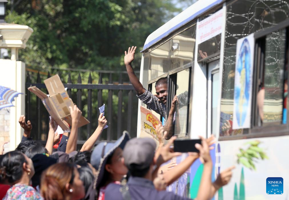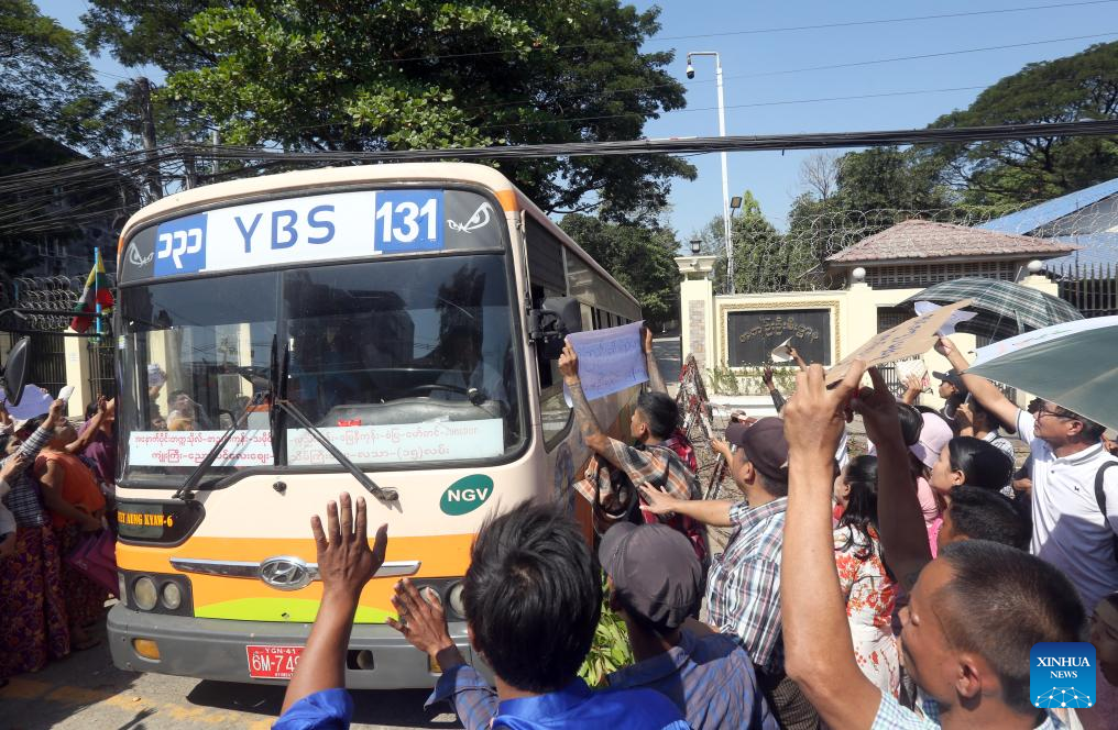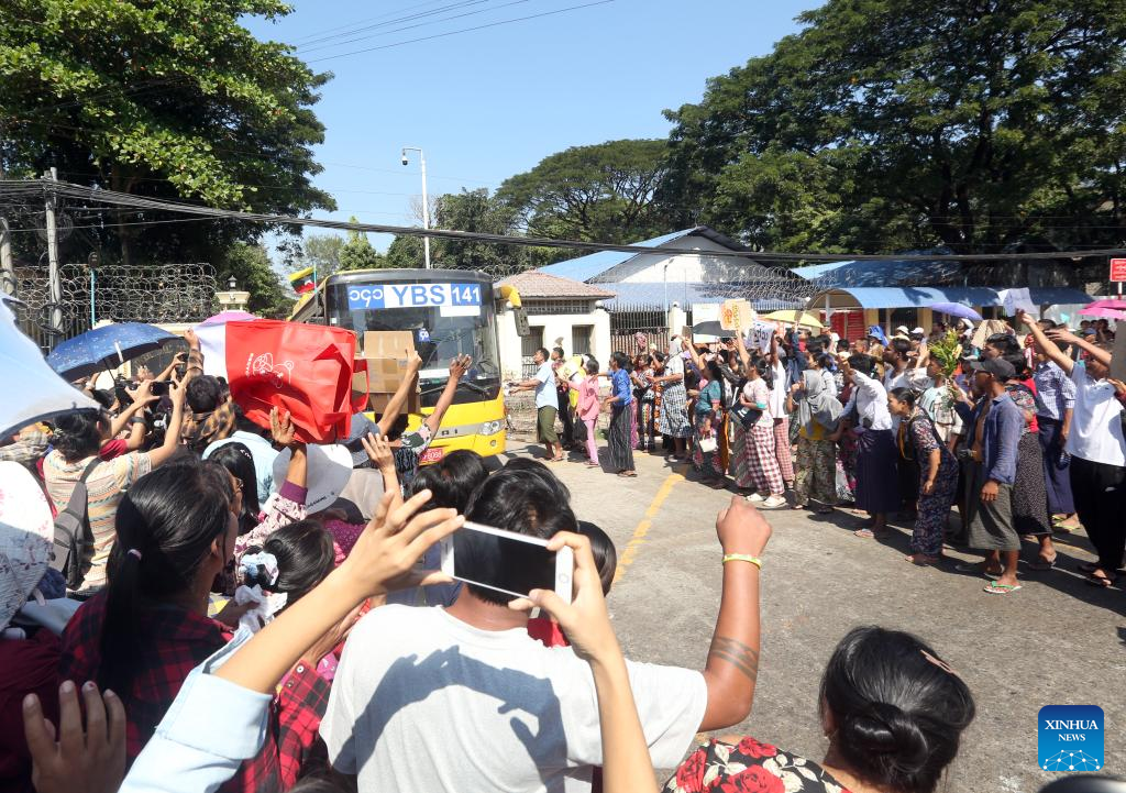 A bus carrying prisoners granted amnesty on Myanmar's 76th Anniversary of Independence Day departs from the Insein Prison in Yangon, Myanmar, Jan. 4, 2024. Myanmar's State Administration Council on Thursday pardoned over 9,000 prisoners to mark the country's 76th Anniversary of Independence Day. (Photo by Haymhan Aung/Xinhua)
