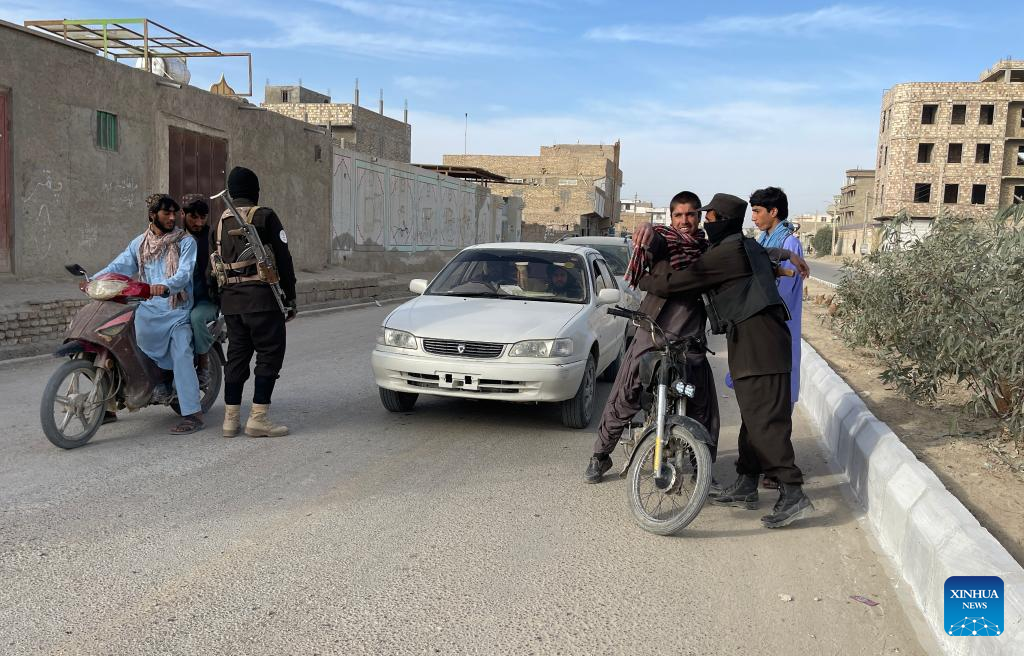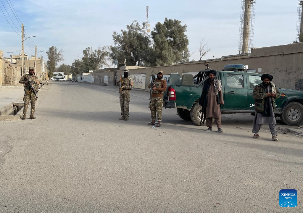Security personnel stand guard near the site of a suicide blast in Nimroz province, Afghanistan, Jan. 14, 2024. (Photo by Aziz/Xinhua)