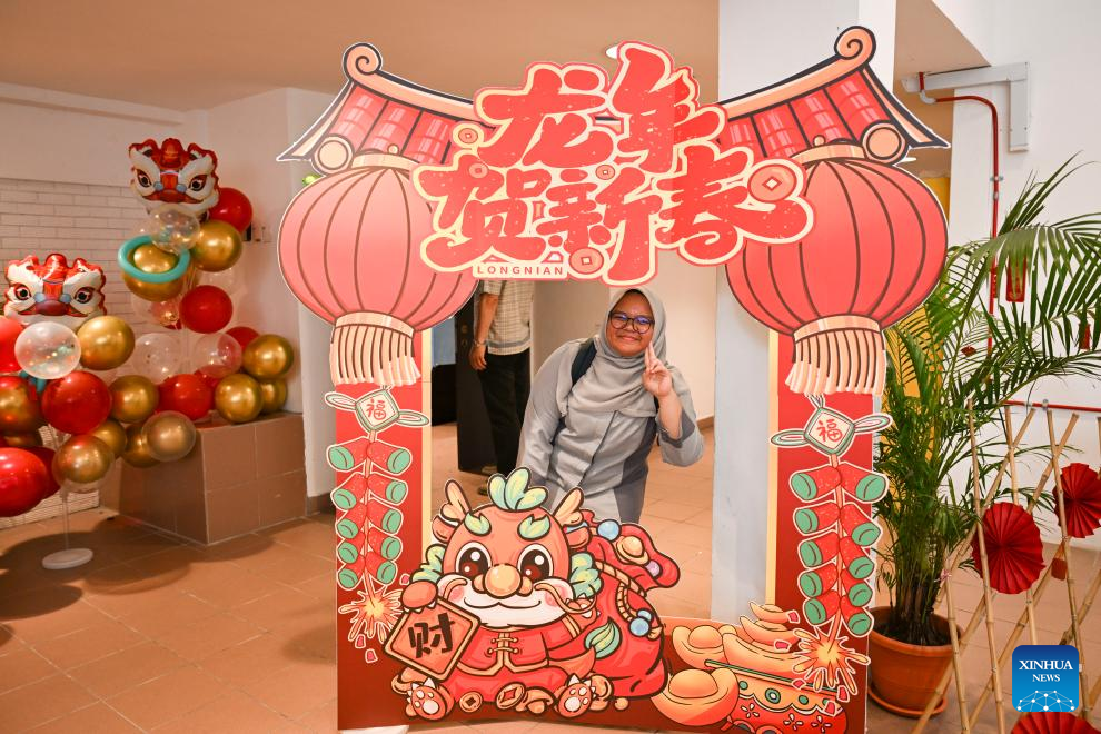 A student poses for photos during the Chinese Lunar New Year celebration at Universiti Malaya in Kuala Lumpur, Malaysia, Jan. 17, 2024. Close collaboration with China accelerates internationalization of Malaysia's higher education and promotes sustainable economic and social development, a Malaysian educator said on Wednesday. (Xinhua/Cheng Yiheng)