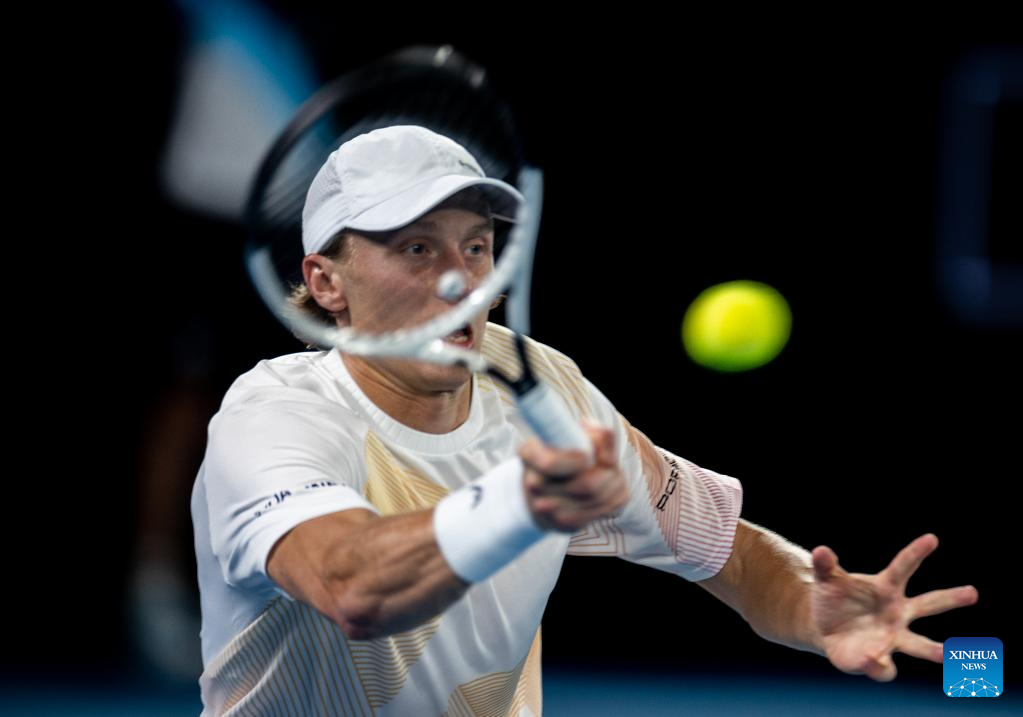 Emil Ruusuvuori of Finland returns a shot during the men's singles second round match between Daniil Medvedev of Russia and Emil Ruusuvuori of Finland at the Australian Open tennis tournament in Melbourne, Australia, Jan. 18, 2024. (Photo by Hu Jingchen/Xinhua)