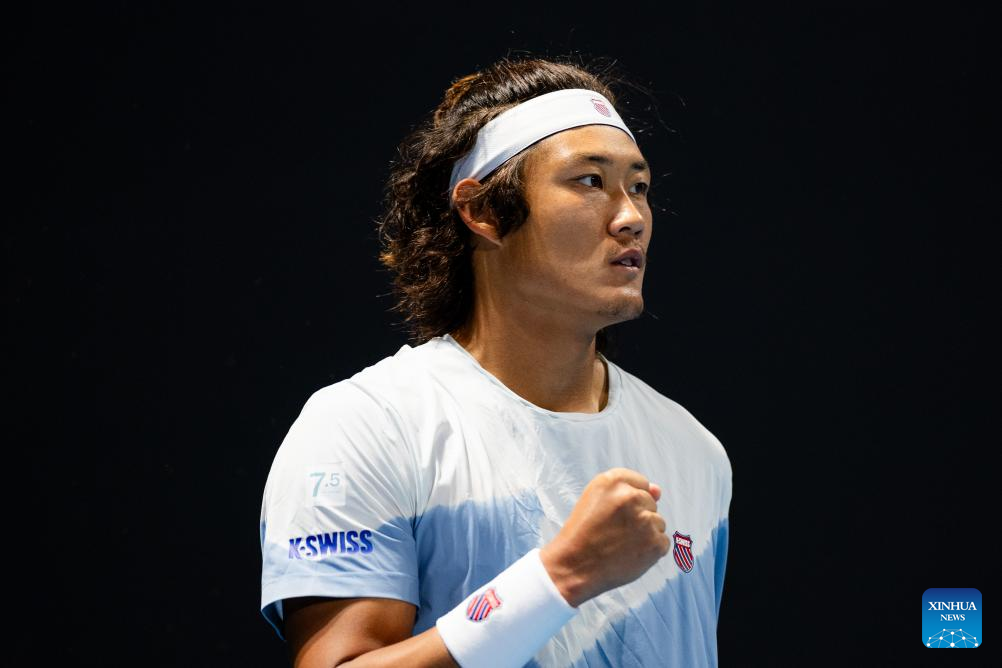 Zhang Zhizhen of China reacts during the men's singles second round match Ugo Humbert of France and Zhang Zhizhen of China at the Australian Open tennis tournament in Melbourne, Australia, Jan. 18, 2024. (Photo by Chu Chen/Xinhua)