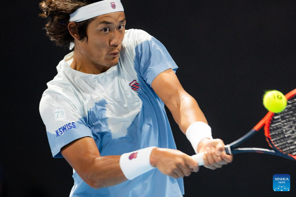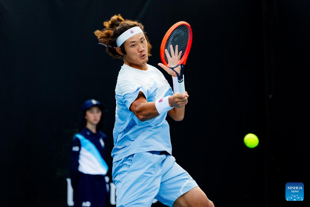 Zhang Zhizhen of China hits a return during the men's singles second round match Ugo Humbert of France and Zhang Zhizhen of China at the Australian Open tennis tournament in Melbourne, Australia, Jan. 18, 2024. (Photo by Chu Chen/Xinhua)