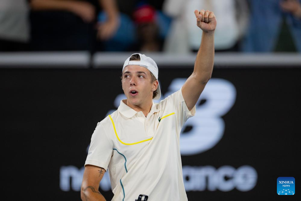 Arthur Cazaux celebrates after the men's singles second round match between Arthur Cazaux of France and Holger Rune of Denmark at the Australian Open tennis tournament in Melbourne, Australia, Jan. 18, 2024. (Photo by Chu Chen/Xinhua)