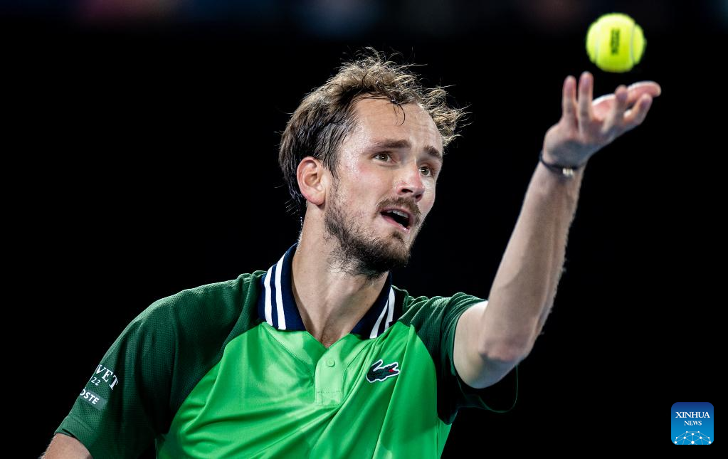 Daniil Medvedev of Russia serves during the men's singles second round match between Daniil Medvedev of Russia and Emil Ruusuvuori of Finland at the Australian Open tennis tournament in Melbourne, Australia, Jan. 18, 2024. (Photo by Hu Jingchen/Xinhua)
