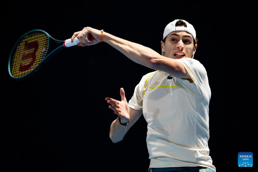 Ugo Humbert of France hits a return during the men's singles second round match Ugo Humbert of France and Zhang Zhizhen of China at the Australian Open tennis tournament in Melbourne, Australia, Jan. 18, 2024. (Photo by Chu Chen/Xinhua)
