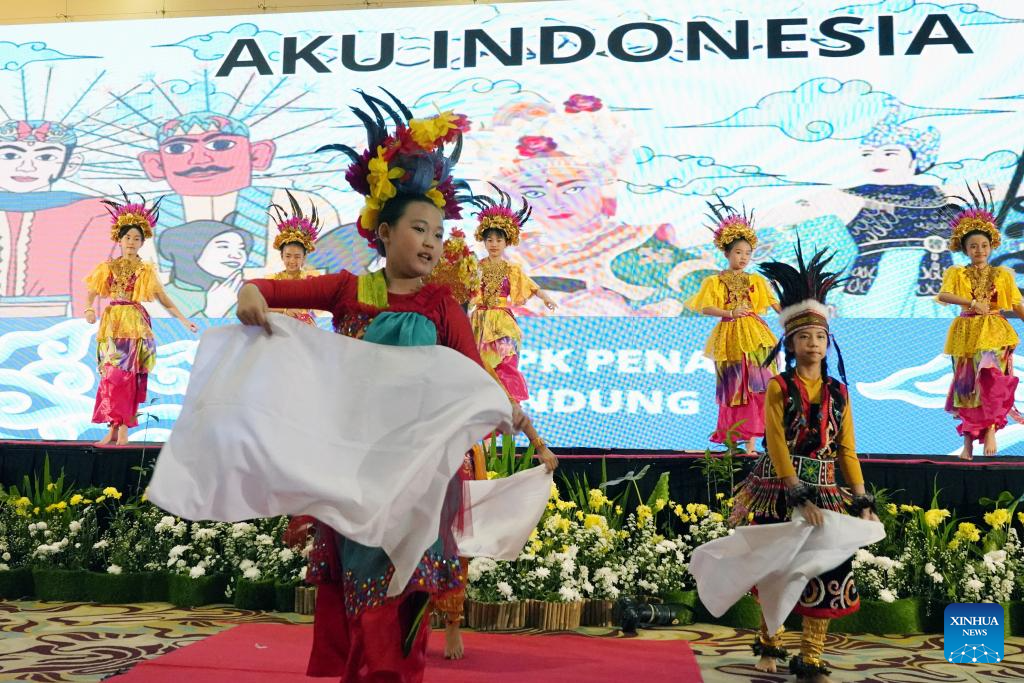 Children perform during the Third Indonesia "Shenmo Cup" International Abacus Mental Arithmetic Competition in Bandung, West Java, Indonesia, Jan. 20, 2024. The event kicked off on Saturday with nearly 200 children competing in this year's competition. (Xinhua/Ma Ning)