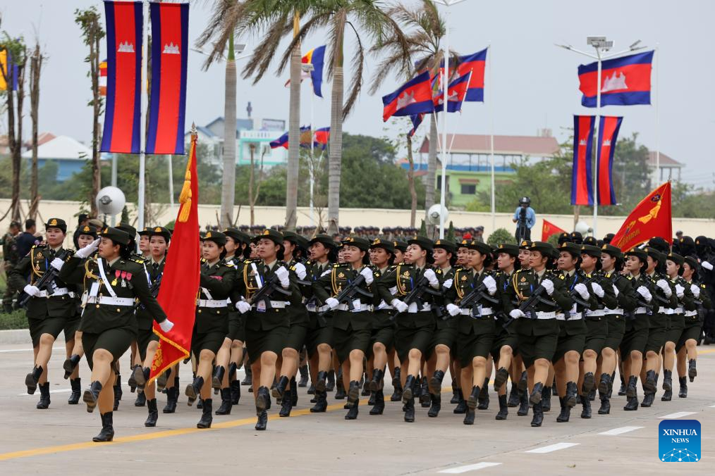 Female troops march in celebration of the 25th anniversary of the founding of the Royal Cambodian Army (RCA) in Phnom Penh, Cambodia, Jan. 24, 2024. Cambodia on Wednesday celebrated the 25th anniversary of the founding of the RCA, an arm of the Royal Cambodian Armed Forces (RCAF).(Photo by Sovannara/Xinhua)