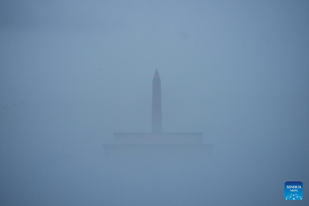 This photo taken on Jan. 25, 2024 shows the Washington Monument and the Lincoln Memorial shrouded in fog in Washington, D.C., the United States. (Xinhua/Liu Jie)