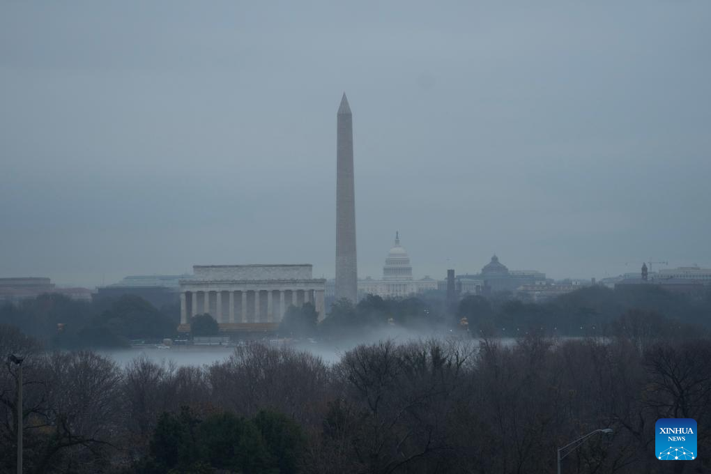 This photo taken on Jan. 25, 2024 shows the U.S. Capitol building, the Washington Monument and the Lincoln Memorial shrouded in fog in Washington, D.C., the United States. (Xinhua/Liu Jie)