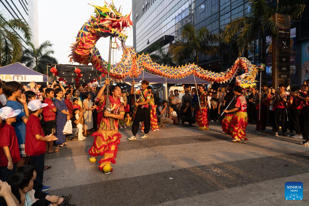 Dragon dancers perform during a celebration event of the Chinese Lunar New Year at a bazaar in Yangon, Myanmar, Feb. 10, 2024. (Xinhua/Li Guangtao)