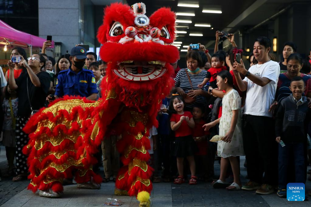 Lion dancers perform during a celebration event of the Chinese Lunar New Year at a bazaar in Yangon, Myanmar, Feb. 10, 2024. (Photo by Myo Kyaw Soe/Xinhua)