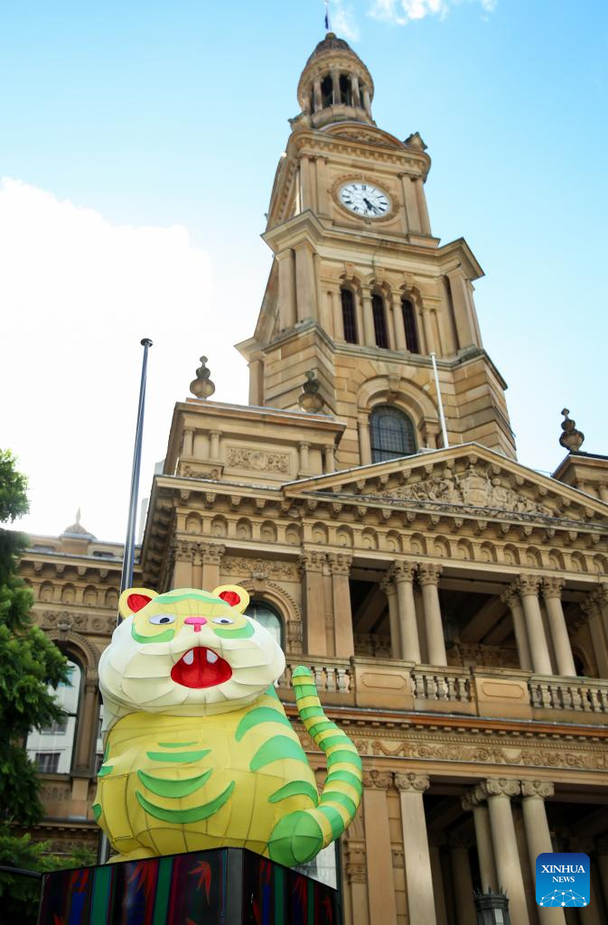 This photo taken on Feb. 10, 2024 shows a tiger-shaped lantern designed by Chinese-Australian artist Erika Zhu displayed in front of Sydney's Town Hall in Sydney, Australia. As part of a 16-day "welcoming party" underway in Australia's Sydney for the Year of Dragon, a collection of 12 Chinese Zodiac lanterns featuring 12 animals were lighting the way from Sydney's Town Hall down to Chinatown in Haymarket precinct.(Xinhua/Ma Ping)