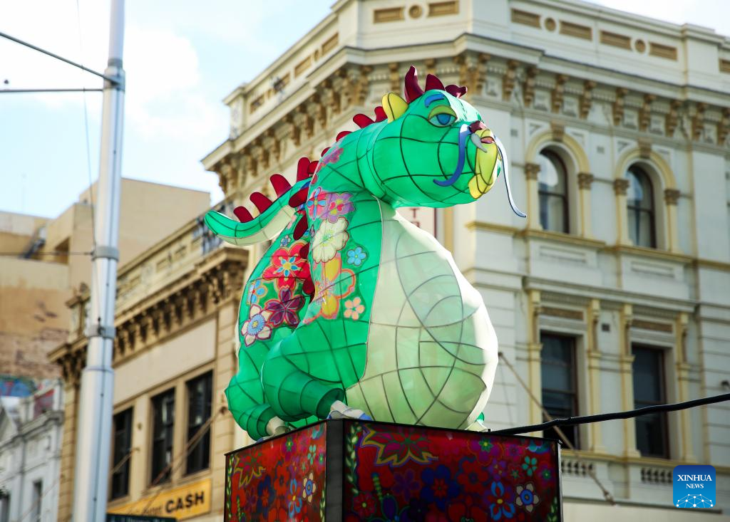 This photo taken on Feb. 10, 2024 shows a dragon-shaped lantern designed by Chinese-Australian artist Erika Zhu displayed in Sydney, Australia. As part of a 16-day "welcoming party" underway in Australia's Sydney for the Year of Dragon, a collection of 12 Chinese Zodiac lanterns featuring 12 animals were lighting the way from Sydney's Town Hall down to Chinatown in Haymarket precinct.(Xinhua/Ma Ping)