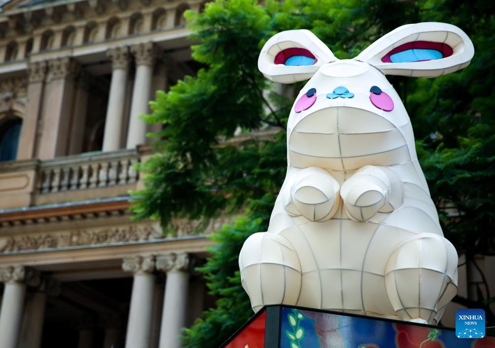 This photo taken on Feb. 10, 2024 shows a rabbit-shaped lantern designed by Chinese-Australian artist Erika Zhu displayed in front of Sydney's Town Hall in Sydney, Australia. As part of a 16-day "welcoming party" underway in Australia's Sydney for the Year of Dragon, a collection of 12 Chinese Zodiac lanterns featuring 12 animals were lighting the way from Sydney's Town Hall down to Chinatown in Haymarket precinct.(Xinhua/Ma Ping)
