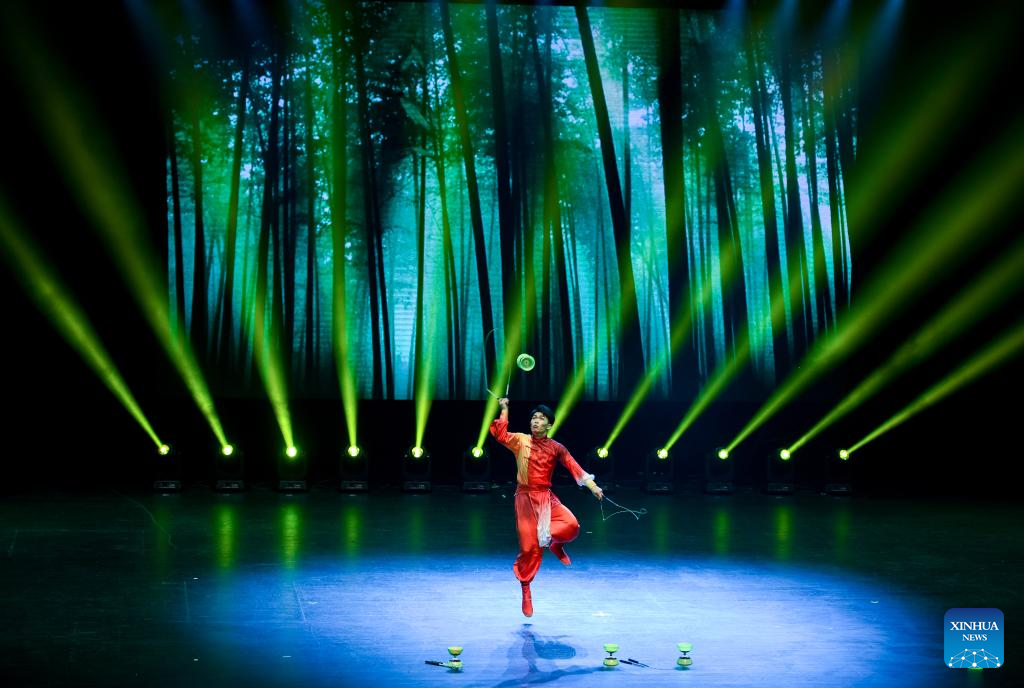 Performer Yan Xiangyu performs acrobatics during the "Festival of Spring" Chinese Lunar New Year Gala Night in Auckland, New Zealand, Feb. 13, 2024. The "Festival of Spring" Chinese Lunar New Year Gala Night was held on Tuesday night in Auckland, the largest city of New Zealand.