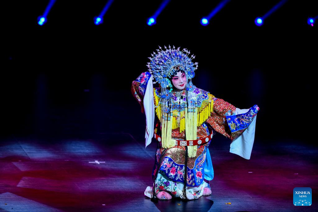 Peking Opera artist Wenge Hu, who is the third-generation successor of the Mei School of Peking Opera, performs during the "Festival of Spring" Chinese Lunar New Year Gala Night in Auckland, New Zealand, Feb. 13, 2024. The "Festival of Spring" Chinese Lunar New Year Gala Night was held on Tuesday night in Auckland, the largest city of New Zealand.