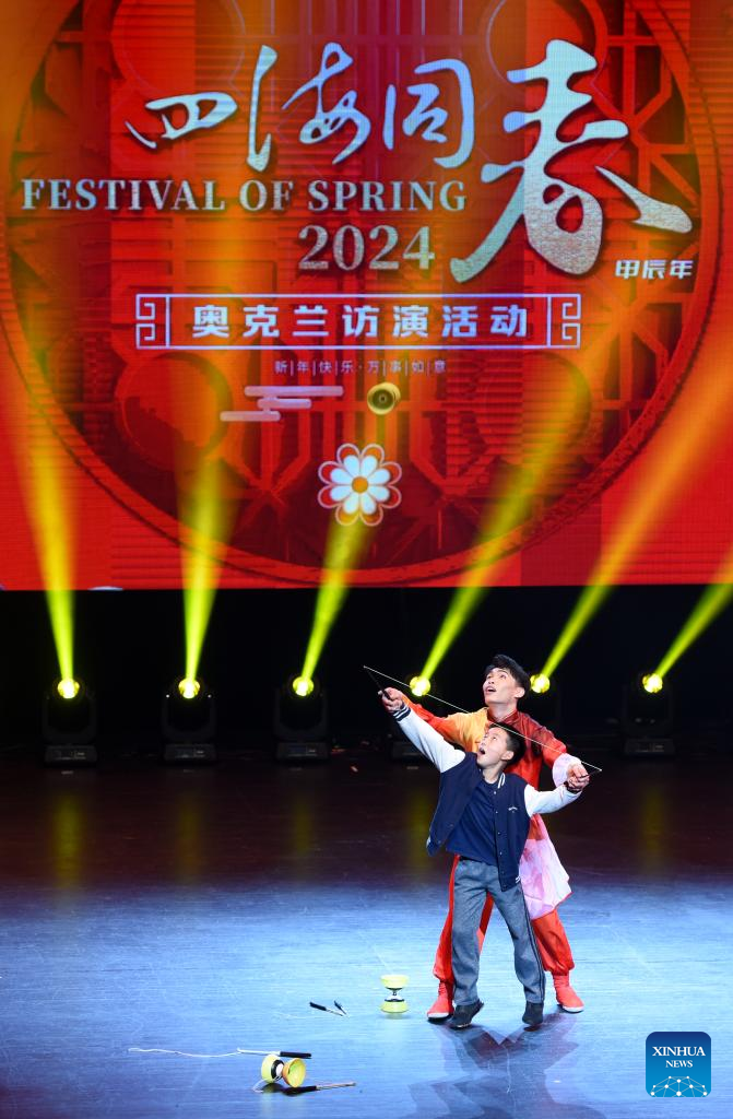 The "Festival of Spring" is a national cultural brand hosted by the Overseas Chinese Affairs Office of China's State Council, and the All-China Federation of Returned Overseas Chinese, a Chinese civic organization. This year, the "Festival of Spring" art troupe from China comprised 35 artists who started their tour performances from Auckland. (Xinhua/Guo Lei)