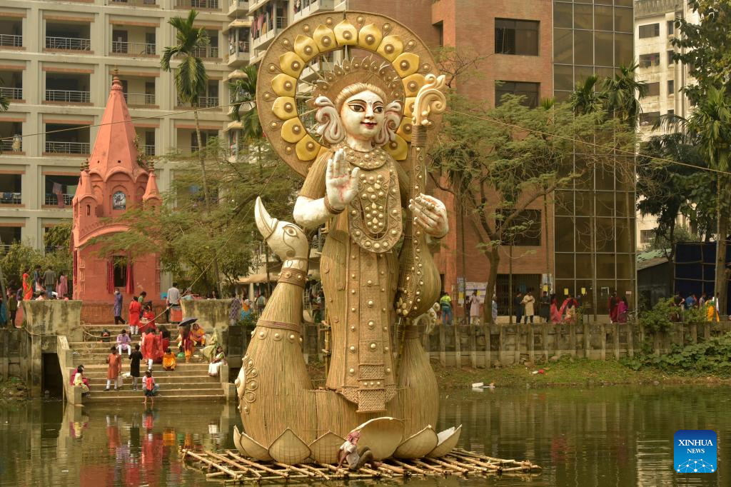 This photo taken on Feb. 14, 2024 shows the idol of goddess Saraswati during Saraswati Puja Festival in Dhaka, Bangladesh. The Hindu community in Bangladesh on Wednesday celebrated Saraswati Puja Festival by worshipping Saraswati, the Hindu Goddess of knowledge, wisdom, arts and music. (Xinhua)