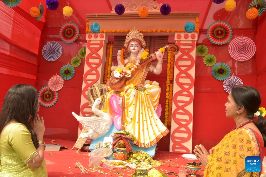 Hindu devotees worship an idol of goddess Saraswati during the Saraswati Puja Festival at a temple in Dhaka, Bangladesh, Feb. 14, 2024. The Hindu community in Bangladesh on Wednesday celebrated Saraswati Puja Festival by worshipping Saraswati, the Hindu Goddess of knowledge, wisdom, arts and music. (Xinhua)