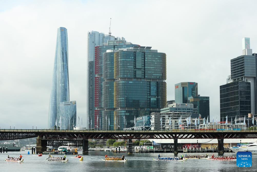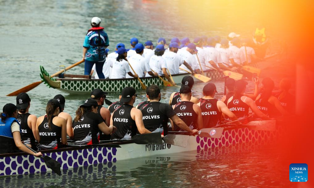 Participants race during the Sydney Lunar New Year Dragon Boat Festival 2024 at Darling Harbour in Sydney, Australia, Feb. 16, 2024. (Xinhua/Ma Ping)