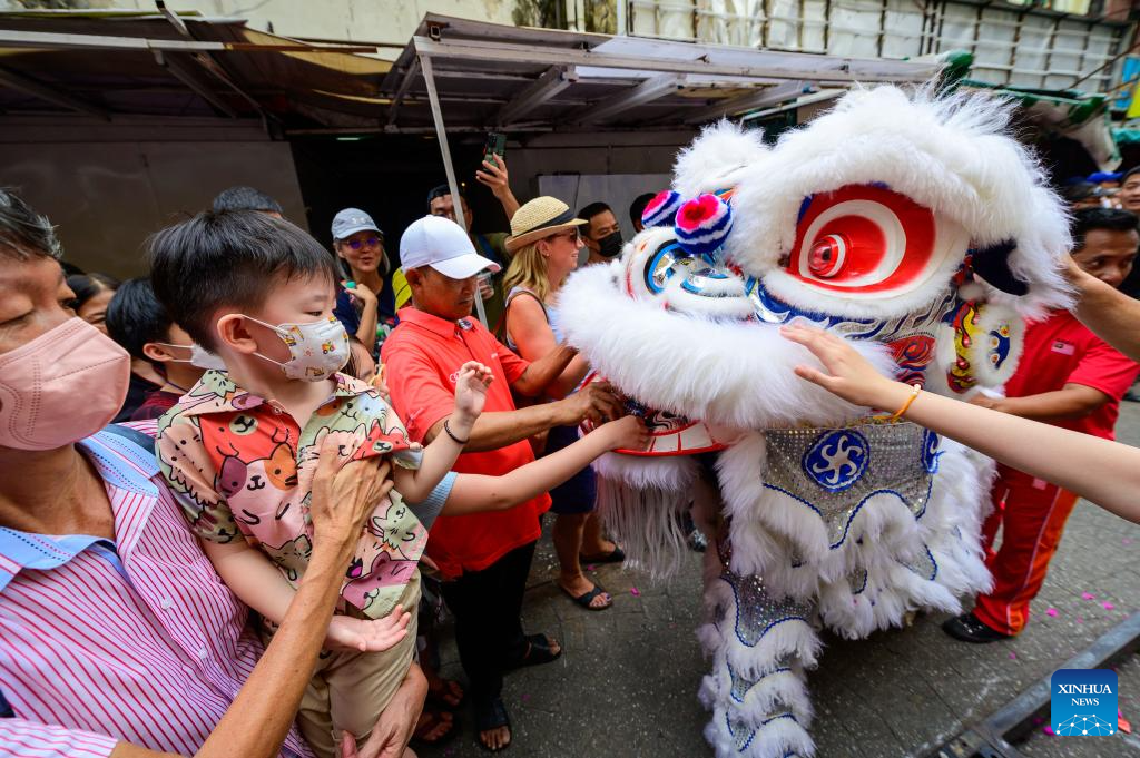 Members of a lion dance troupe perform during the Lantern Festival celebration at Petaling Street of Kuala Lumpur, Malaysia, Feb. 24, 2024. (Photo by Chong Voon Chung/Xinhua)
