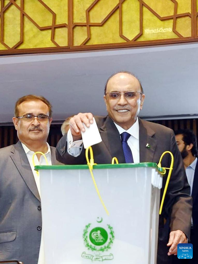 Photo released by Pakistan's Press Information Department (PID) on March 9, 2024 shows Asif Ali Zardari casting his vote during the presidential election in Islamabad, capital of Pakistan. Ruling coalition candidate Asif Ali Zardari won the presidential election of Pakistan with an overwhelming lead on Saturday, the Election Commission of Pakistan announced. (PID/Handout via Xinhua)