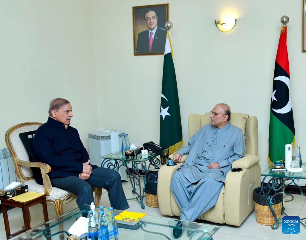 This photo released by Pakistan's Press Information Department (PID) on March 9, 2024 shows the Pakistani Prime Minister Shehbaz Sharif (L) meets with newly-elected Pakistan's President Asif Ali Zardari in Islamabad, capital of Pakistan. Ruling coalition candidate Asif Ali Zardari won the presidential election of Pakistan with an overwhelming lead on Saturday, the Election Commission of Pakistan announced. (PID/Handout via Xinhua)