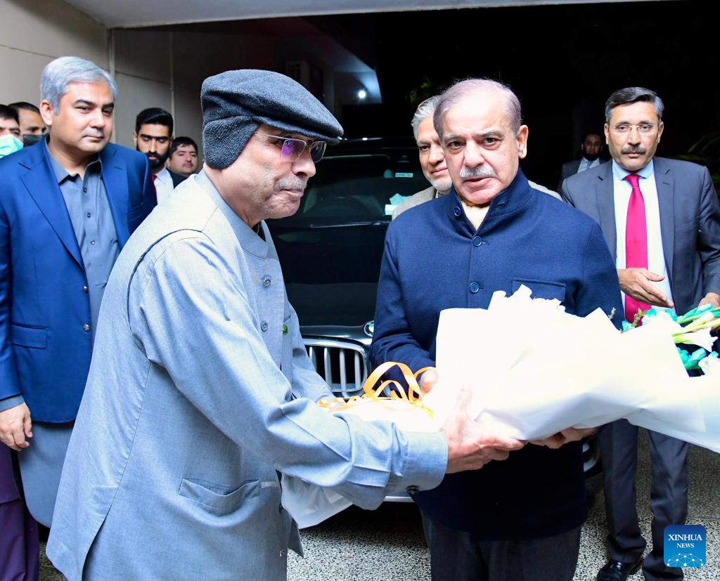 This photo released by Pakistan's Press Information Department (PID) on March 9, 2024 shows the Pakistani Prime Minister Shehbaz Sharif (1st R, front) greeting newly-elected Pakistan's President Asif Ali Zardari (1st L, front) in Islamabad, capital of Pakistan. Ruling coalition candidate Asif Ali Zardari won the presidential election of Pakistan with an overwhelming lead on Saturday, the Election Commission of Pakistan announced. (PID/Handout via Xinhua)