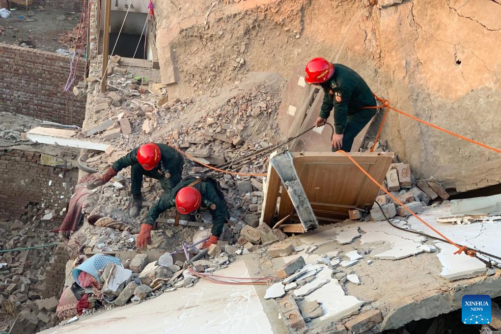 Rescuers search for survivors at the site of a collapsed building in Multan, Pakistan, on March 12, 2024. At least 9 people were killed and two others severely injured on Tuesday after a residential building collapsed in Multan city of Pakistan's eastern Punjab province, local authorities said. (Str/Xinhua)