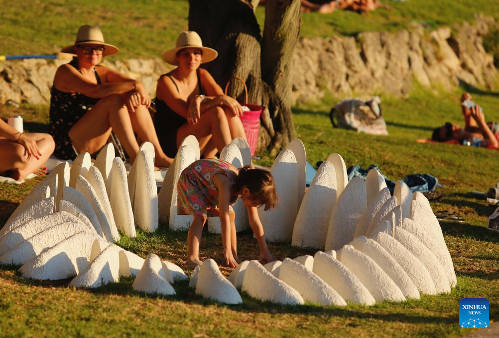 A girl plays near an artwork on Cottesloe Beach in Perth, Australia, March 13, 2024. The 20th "Sculpture by the Sea, Cottesloe" is held here from March 1 to March 18 this year. (Photo by Zhou Dan/Xinhua)