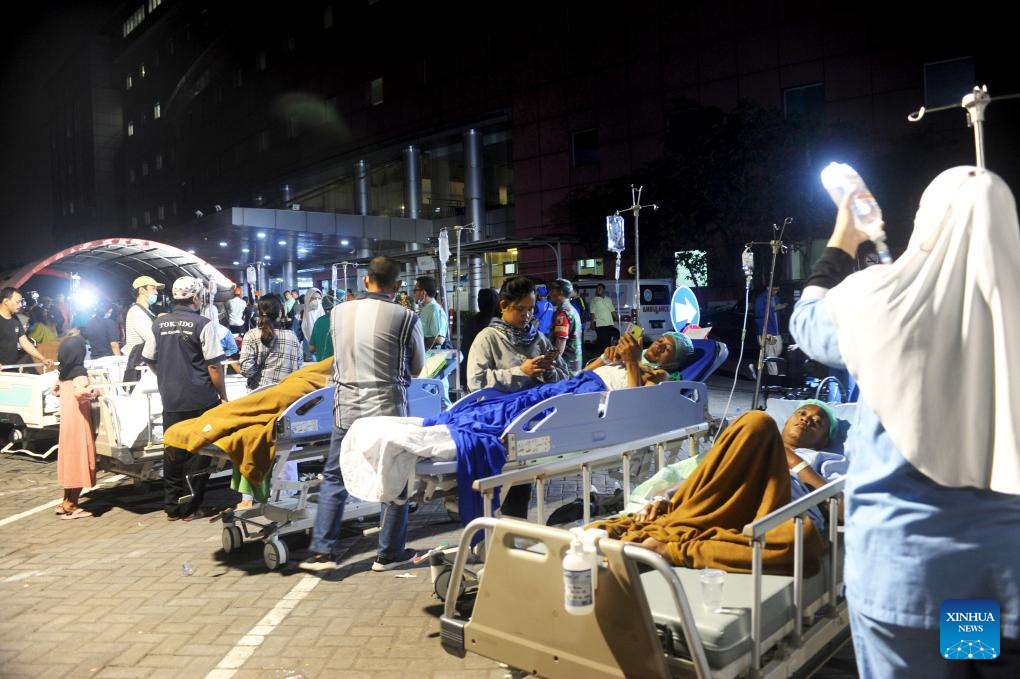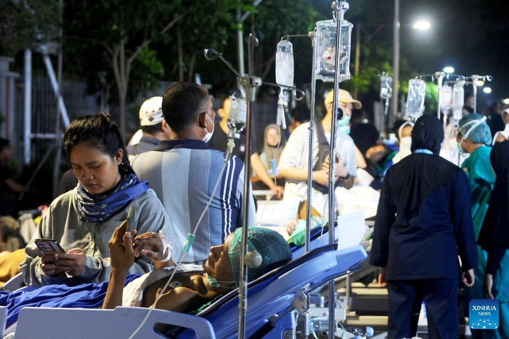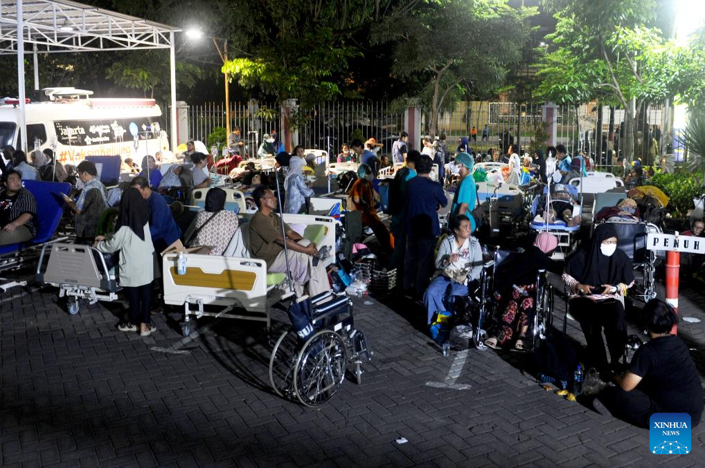 People gather outside a hospital in case of aftershocks in Surabaya, East Java, Indonesia, on March 22, 2024. An earthquake measuring 6.0 on the Richter scale struck off East Java on Friday without triggering a tsunami, the country's meteorology, climatology and geophysics agency said. (Photo by Sahlan Kurniawan/Xinhua)